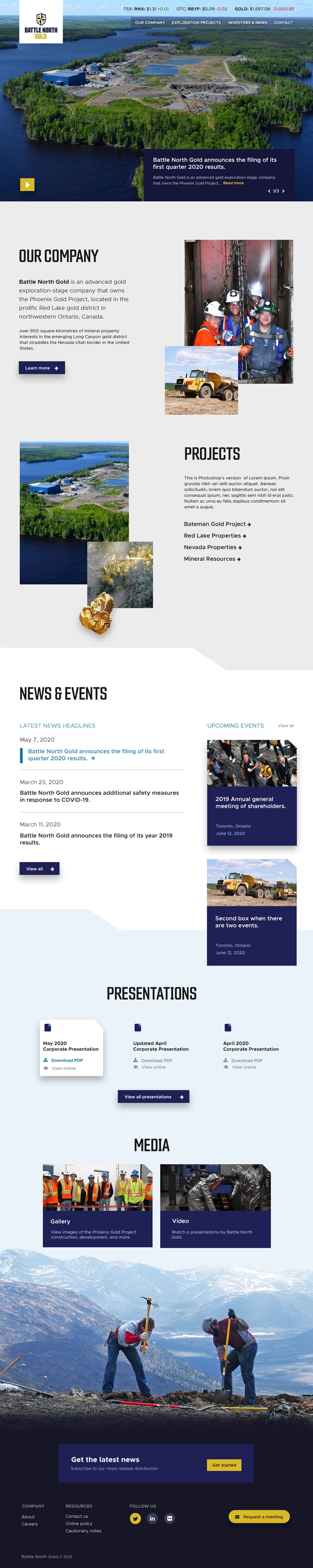 I played more with darker colors and full-width images in this concept. To tell the story of Battle North Gold, I wanted the sections to smoothly parallax into each other. To contrast the large imagery at the top, I made the News & Events and Media sections have minimal color and photography. I used a serif typeface for the copy in Our Company to make the brand and company look established.
