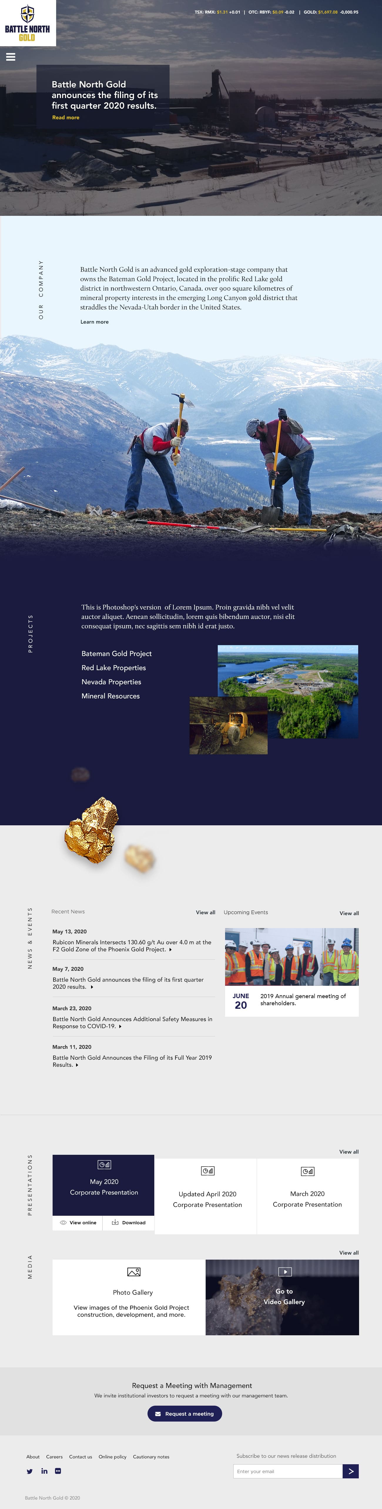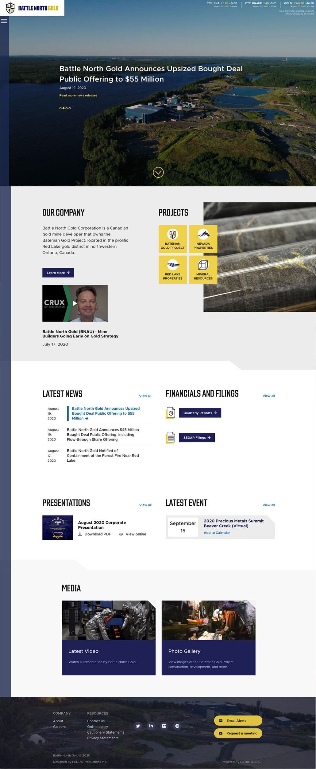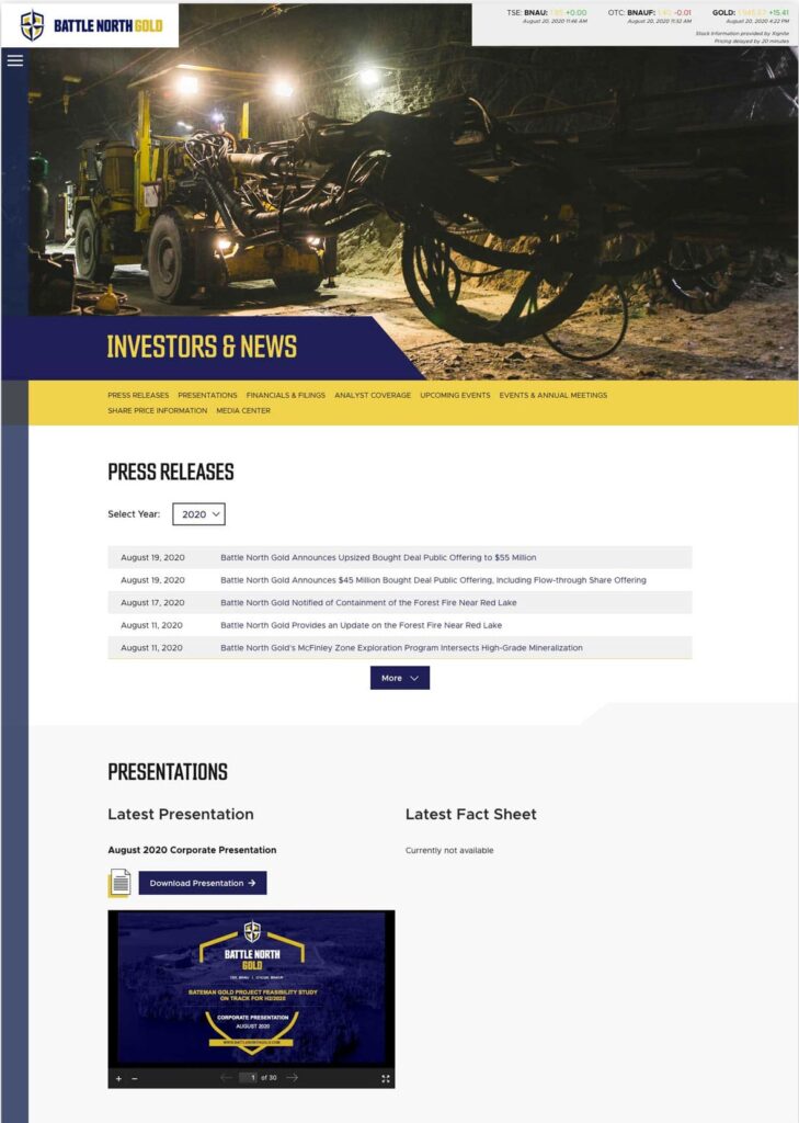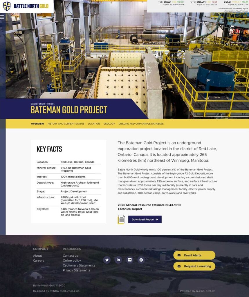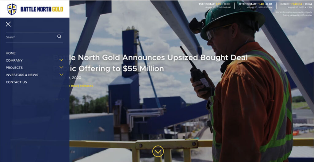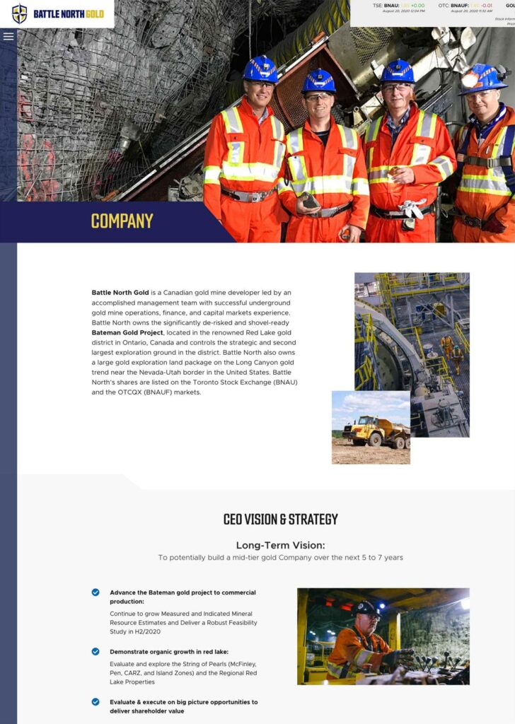 Battle North Gold was a gold mine developer located in Ontario, Canada. The Bateman Gold Project was rebranded as Battle North Gold and required a new website to reflect the new brand. In 2021, they were acquired by Evolution Mining Limited.